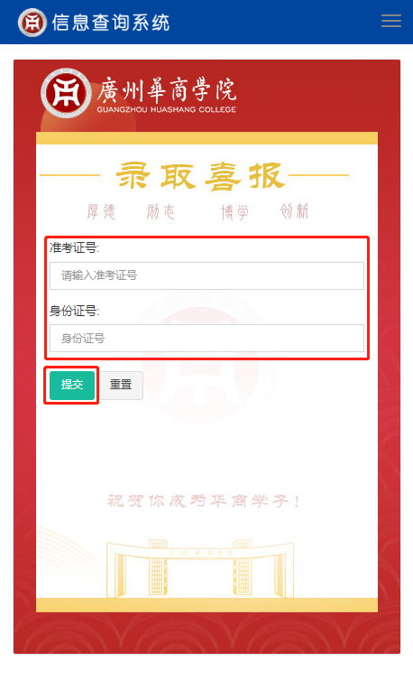 1.进入网站首页(广州华商学院招生信息网:http://zs.gdhsc.edu.cn/),点击"录取/成绩信息查询"