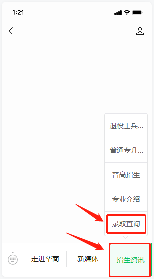 2.进入“ok138太阳集团古天乐招生办”公众号,点击菜单栏“招生资讯”,选择“录取查询”