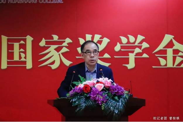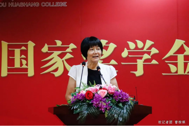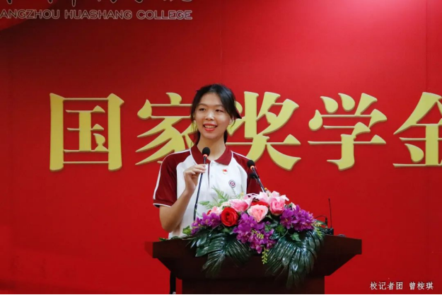 荣获“国家奖学金”的学生代表黄楚蕾同学发言。她回顾了自己步入大学三年来的奋斗历程,并分享收获和感悟。她认为,学生要把学习作为本职工作,持之以恒地养成良好的学习习惯,掌握合适的学习方法,涉猎不同的知识技能;应积极参与校内外的志愿服务,贡献出属于自己的青春力量。同时,她向学校、领导、老师及同学表达出最诚挚的感谢,鼓励大家以奋斗书写精彩人生,不负时代、不负韶华。