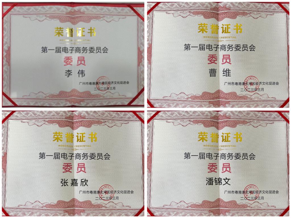 大会上,经济贸易学院跨境电子商务专业李伟、曹维、张嘉欣、潘锦文四位老师被广州市粤港澳大湾区经济文化促进会评为首届电子商务委员会委员。