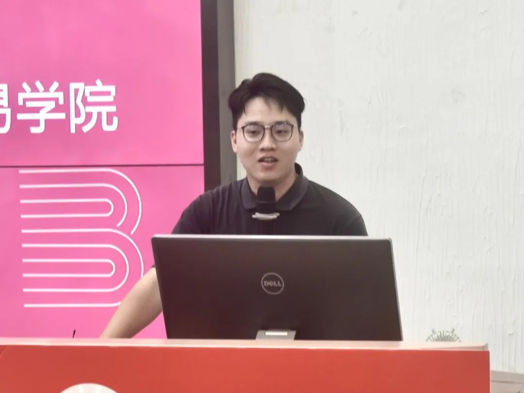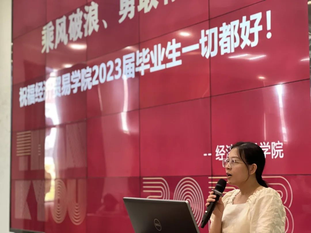 接下来,毕业生代表陈晓漳师兄代表经济贸易学院19级全体毕业生向辛勤付出的领导和老师们表示最衷心的感谢,同时也为大家分享了工作和面试的相关经验。