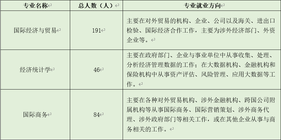 经济贸易学院2024届毕业生共有321名,其中,国际经济与贸易专业毕业生191名,学生掌握服务外包、国际会展组织与策划、数字平台运营、财务数据分析、跨文化交流等专业知识,可从事电商平台运营、平台数据统计、互联网数据分析、数字营销策划、广交会及各类国际会展的组织与策划以及国际结算、国际运输、国际保险等服务贸易综合领域的相关工作等相关工作;经济统计学专业毕业生46名,学生熟悉数字经济发展、大数据技术基本原理,精通各类数据收集、整理、分析方法,掌握大数据管理和应用技能,可在各类企业从事大数据抓取、挖掘、管理运营,分析、企业数字化管理等工作;国际商务专业84名,学生掌握国际经济与合作、跨国投资与运营以及其它国际商务相关活动运行规律,熟悉企业国际化管理特色,熟练掌握新媒体国际营销理论与方法,具备从事企业跨国经营管理能力,适应跨国经营数字化环境,能在跨国公司或涉外政府部门及国际组织等从事国际商务相关工作。