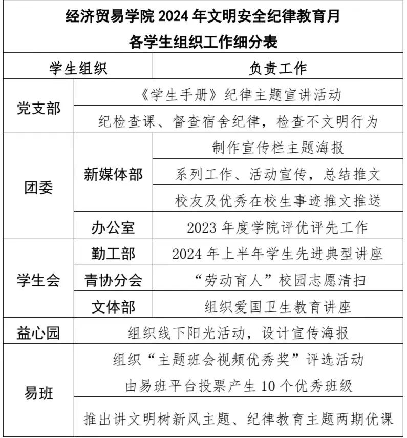 学院学工办根据学校统一部署要求,召开教育月骨干动员会,对本次文明安全纪律教育月进行动员以及工作部署。统筹部署教育月主要工作,协调有关事宜,制定活动方案,各学生组织、各班级认真落实。详情参照经济贸易学院2024年文明安全纪律教育月各学生组织工作细分表。