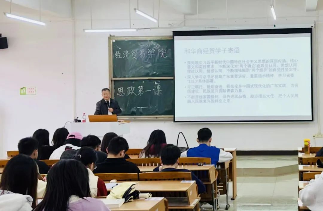 2024年3月5日,经济贸易学院李广明院长在广州校区励志楼C402为经济贸易学院2021级学生讲授以“踔厉奋发,学好本领,积极投身高质量发展的广东实践”为主题的思政第一课。首先,李广明院长以“人勤春来早”开篇,带领同学们学习全省高质量发展大会相关内容,引导同学们学习领会“以高质量发展推进中国式现代化”的深刻内涵。生产力是社会发展的最终决定力量,推进现代化建设最重要的是发展高度发达的生产力。习近平总书记强调发展新质生产力是推动高质量发展的内在要求和重要着力点。新质生产力的特点是创新,关键在质优,本质是先进生产力。