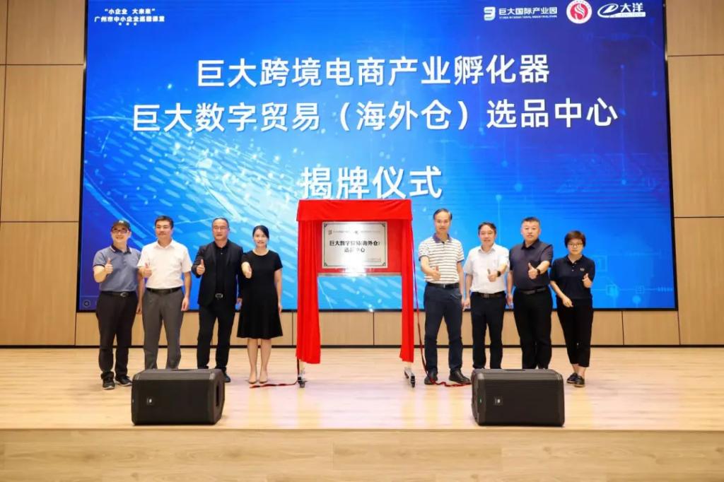 巨大跨境电商产业孵化器/巨大数字贸易(海外仓)选品中心由广州市工业与信息化局服务体系建设处二级调研员陈思宁、广东女子职业技术学院副校长何文华、番禺区人才交流管理办公室主任崔志晖、广东省跨境商品贸易协会执行会长王会明、广州市直播电子商务行业协会秘书长王刚、广东女子职业技术学院外贸学院院长李淑苹、巨大国际产业园总经理王巍、广州大洋教育科技股份有限公司董事长周春翔共同揭牌。