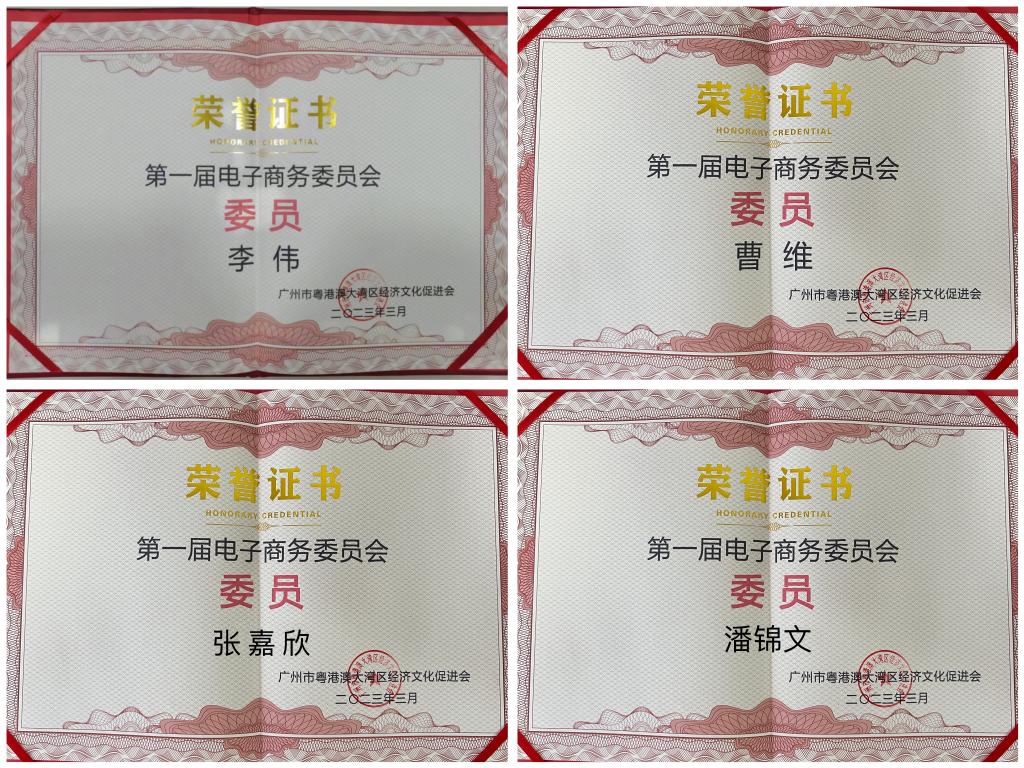 大会上,经济贸易学院跨境电子商务专业李伟、曹维、张嘉欣、潘锦文等四位老师被广州市粤港澳大湾区经济文化促进会评为首届电子商务委员会委员。