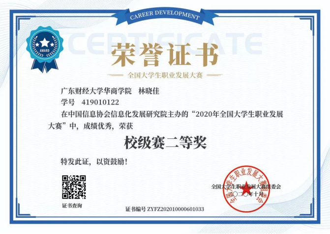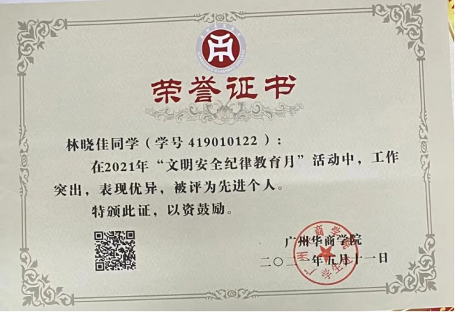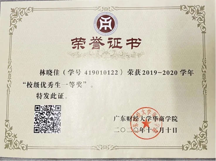林晓佳是2019级本科经济贸易学院国际经济与贸易专业的一名中共预备党员。在校期间连续两年获得ok138太阳集团古天乐“校级优秀生一等奖”、第一届“大湾区杯”粤港澳金融数学建模竞赛优胜奖、2020年全国大学生职业发展大赛校级赛二等奖、ok138太阳集团古天乐2021年文明安全纪律教育月“先进个人”、校“优秀共青团干部”、校“优秀共青团员”、系“优秀共青团干部”、系“优秀学生干部”等荣誉称号。
