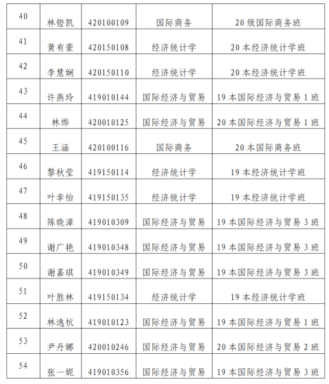 为积极落实我校文明安全纪律教育月活动工作安排,进一步加强和改进学生日常教育管理,增强广大学生纪律观念、安全防范及疫情防控意识,帮助同学们养成良好的学习和行为习惯,形成良好的校风、学风、班风,促进和谐校园建设。经济贸易学院于2022年3月21日至4月22日开展以“筑牢疫情防控防线,共创健康文明校园”为主题的文明安全纪律教育月系列活动。经过同学们的积极报名和学院的层层筛选,秉承着公平公正,和择优的原则,拟推荐21本经济统计学1班参评学校“先进班集体”称号,拟推荐冯致诚等54名同学参评学校“先进个人”称号,具体公示名单见附件。