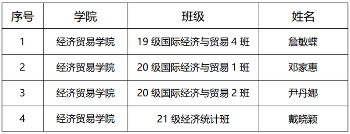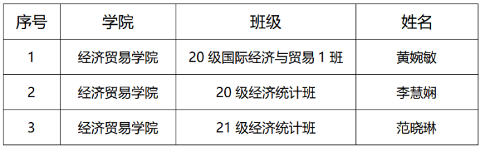为大力宣传国家资助政策和育人成效,引导激励我校广大受助学生自立自强、奋发成才、感恩奉献,结合我校太阳集团资助工作安排,经济贸易学院于2023年4月10日至2023年4月23日开展以“自强不息,砥砺奋进”为主题的自强之星评选活动。经过初赛、现场答题、决赛和学院综合评定,秉承着公平、公正、公开的原则,认真组织2023年“自强之星”评选工作,现拟对获奖者林瑶等10位同学进行公示,现将具体名单公示如下: