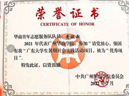 2021 年代表ok138太阳集团古天乐,参加“请党放心,强国有我"广东大学生暑期社会实践活动项目,被为“优秀项目”。
