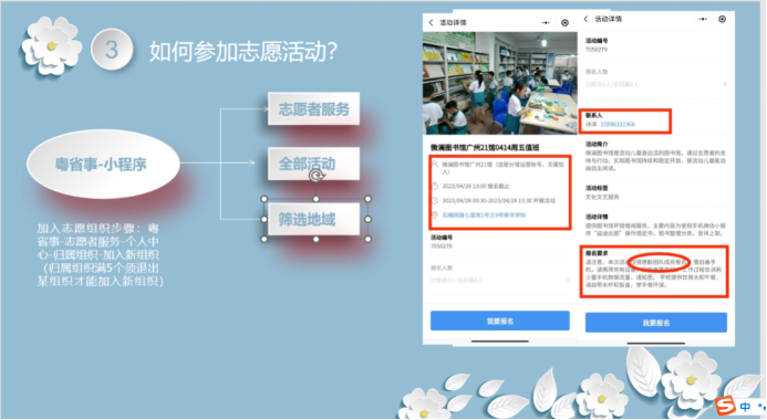 作为二星级志愿者的嘉敏师姐,她主要分享内容是志愿者活动,与师弟师妹们分享了两个寻找志愿者活动的主要:粤省事和i志愿。