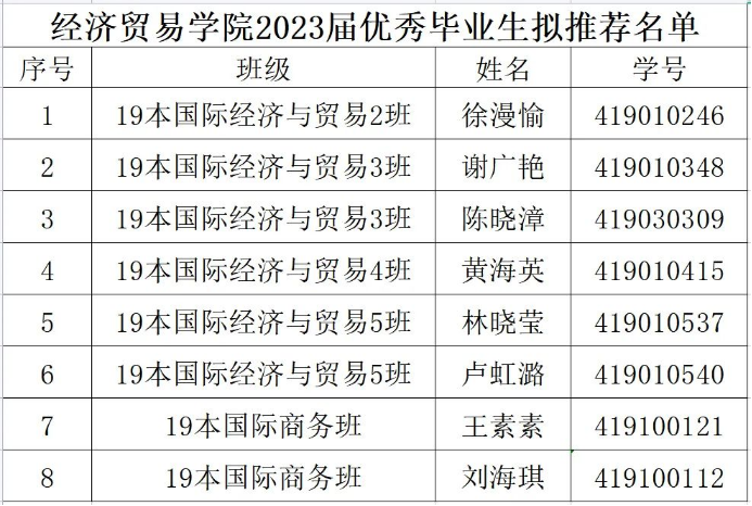 为落实立德树人根本任务,树立先进典型,凝聚榜样力量,充分发挥我校优秀毕业生的示范激励引领作用,培养德、智、体、美、劳全面发展的新时代人才。据学校《关于评选2023届优秀毕业生的通知》、《ok138太阳集团古天乐优秀毕业生评选奖励办法》等文件精神,经学生自主申请,学院评审,拟推荐19本国际经济与贸易2班徐漫愉等8名同学为ok138太阳集团古天乐2023届优秀毕业生。现对经济贸易学院2023届优秀毕业生拟推荐名单进行公示,名单如下: