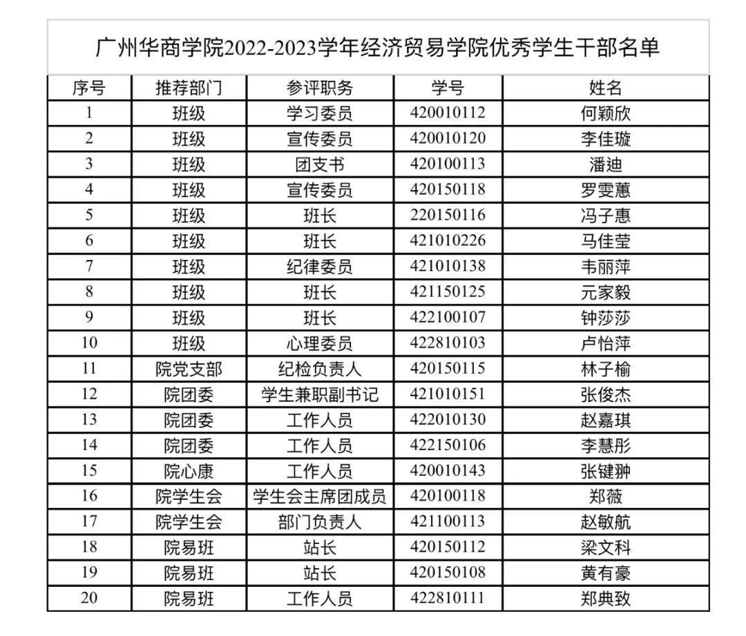 经济贸易学院2022-2023学年优秀学生干部名单公示如下: