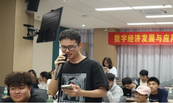 汤教授的主题演讲结束后,学生们紧抓与教授交流机会,争先恐后举手提问。有学生提问:随着数字经济的发展,传统的商业模式面临着哪些挑战和机遇,企业应该如何进行商业模式创新以适应新的市场环境。也有学生问到在制造业、农业、服务业等不同行业中,数字经济的应用呈现出哪些新的趋势和特点。