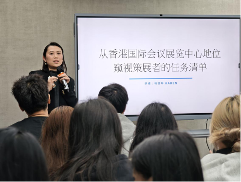 4月13日下午观展结束后,同学们赶往香港观塘区振万大厦,参加第二场会展专业讲座。此次讲座有幸邀请到了资深会展专家杨甘琳(Karen Yeung)女士。她是MICE(会议、奖励旅游、展览、活动)行业的专家,也是玑妙传讯顾问有限公司的创办人与董事,拥有超过20年的策展及活动筹办经验。她不仅从项目助理一步步成长为高级管理人员,更以其深厚的专业背景和丰富的项目经验,为同学们带来了关于会展项目策划管理的深度剖析。在讲座中,她详细讲解了如何完成从概念到执行的全生命周期规划,以及如何通过战略营销将活动与更广泛的营销目标相结合。同时,Karen老师还分享了创新设计在创造独特、难忘的会展体验中的重要性,这些理念与《会展实务》课程的核心教学内容紧密相连,让同学们深刻理解了会展项目的核心价值和实施要点。