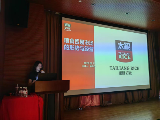 随后,太粮集团资深讲师林开心老师以“粮食贸易市场的形势与经营”为题,为师生们带来了一场干货满满的专题讲座。讲师结合集团多年深耕粮食产业的经验,从全球粮食贸易格局、国内市场供需变化、企业运营策略等维度展开分析,并特别强调了国际贸易政策、物流成本波动、消费者需求升级对粮食贸易的影响。讲座中,开心老师以太粮集团进口大米案例为切入点,解析了如何通过品牌化、标准化和数字化手段提升产品竞争力,并指出“复合型国际经贸人才需兼具市场洞察力、跨文化沟通能力和风险管理意识”。