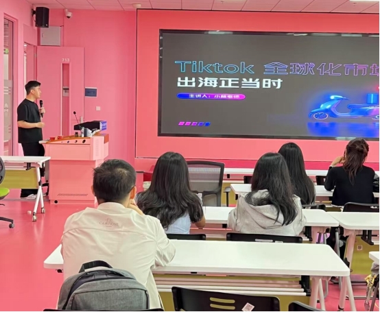 桃花岛跨境工作坊负责人林培民老师以“跨境电商现状与TikTok实战”为主题,结合东南亚美妆、欧美家居等爆品案例,剖析“内容种草+直播转化”的跨境新玩法。“TikTok是年轻一代的‘跨境购物车’,掌握短视频创作与直播互动是未来人才的核心技能!”林老师的分享让学生直呼“打开了新世界”。