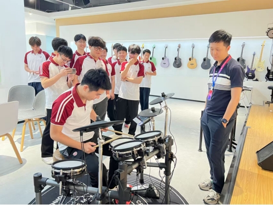 随后,在工作人员带领下,学生们实地参观了蓝深科技的产品研发中心、海外营销部、跨境物流等部门。在乐器展厅,亲手试弹搭载AI陪练功能的智能吉他,体验“科技+音乐”的跨界魅力。互动环节中,同学们围绕“跨境岗位晋升路径”等话题踊跃提问。企业HR建议:“入行需懂音乐文化,善用TikTok、独立站等新渠道;可从运营助理切入,积累实战经验。”蓝深科技表示优先招募外语能力强、有新媒体运营基础的学生。