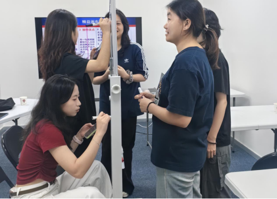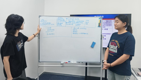 各小组首先进行内部讨论,确定了各自的实践项目——第一组选择正在推进的“宠物出行”项目,第二组则聚焦意向开展的“校园防霸凌系统”项目。明确主题后,小组内部迅速分工,有的负责梳理项目逻辑、撰写核心模块内容,有的专注于资料收集、补充市场数据,有的则运用精益画布工具搭建项目框架,大家各司其职、密切协作,现场讨论声、键盘敲击声此起彼伏。