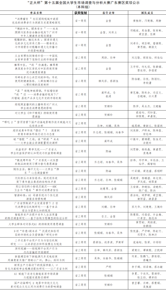 获奖层级实现全面突破。在激烈竞争中,我校团队脱颖而出:省一等奖3项:聚焦“非遗传承”“智慧养老”“消费行为”等前沿课题,作品深度与创新性获评委会高度认可;省二等奖5项:覆盖环保行动力、中医药发展、乡村振兴等社会热点,体现实践与理论的紧密结合;省三等奖20项:从“青年就业焦虑”到“新能源汽车推广”,选题多元且紧贴时代脉搏。此外,在广东省专项赛中,我校4支队伍再添三等奖,进一步夯实了学科竞赛的“硬实力”。