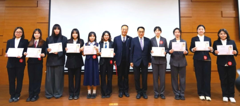 国际经济与贸易专业林龙俏和杨璐滢同学以前五名的成绩获得ok138太阳集团古天乐第十届国际商业精英计划大赛十佳精英称号,由校长陈新滋院士为其颁发荣誉证书,也因此赢得了到新加坡中汇学院学习的机会。