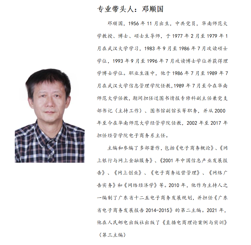 专业负责人邓顺国教授为教育部电子商务教指委委员,带领团队获省级以上教学竞赛奖项10余项,主持国家级、厅级科研项目20余项。