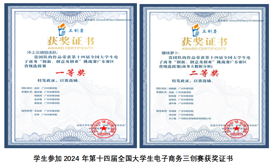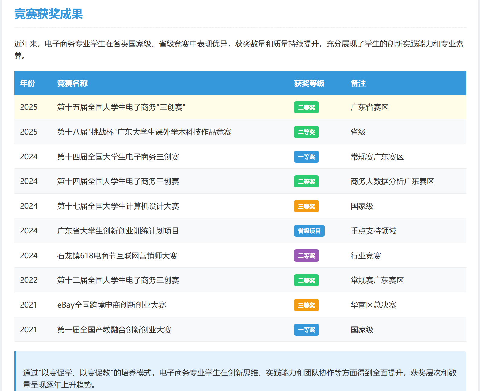 近年来,电子商务专业学生在各类国家级、省级竞赛中表现优异,获奖数量和质量持续提升,充分展现了学生的创新实践能力和专业素养。