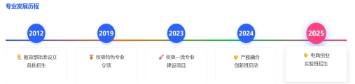 设置电商创业实验班,电商创业实验班致力于培养数字经济时代的电商创新创业精英,采用"真实项目驱动+启动资金+三师孵化+资源赋能"的创新人才培养模式,构建"基础课程+专业课程+创业课程+实践课程"的模块化课程体系,打造"校内+校外+竞赛+国际化"四维实践平台,为学生提供丰富的实践机会。依托学术导师、企业导师和创业校友组成的"三师型"导师团队,引入企业真实项目,对接产业资源,创新实施"入学即创业"培养机制,以实际创业项目运营成果替代传统毕业论文考核。通过系统培养,学生将掌握电商全渠道运营技能,具备创业融资与管理能力,最终成为能够创办电商企业、领导团队、驾驭风险的实战型创新创业人才。
