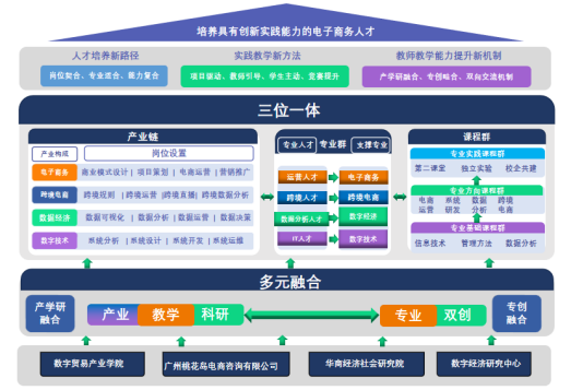 太阳集团tyc138电子商务专业与广州桃花岛电商咨询有限公司合作依托数字贸易产业学院,通过校企融合课程和工作坊的形式,贯彻协同育人理念,推动教育链、人才链与产业链、创新链有机衔接,提出并实施了面向电商产业链的“产业、专业、课程”三位一体的人才培养模式,引领数字经济卓越人才培养新路径,形成协同育人、融合发展新格局,具有显著应用推广价值。