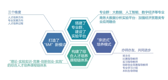 经济统计学系创新性地打造了“6M”新模式。一方面,大力搭建专业群并建设实验平台,其中专业群聚焦大数据、人工智能、数字经济等前沿热门领域,为学子们铺就通往未来科技与经济前沿的道路;商务大数据分析实验平台则着重加强经济贸易类专业应用融合,让理论与实践在深度交融中碰撞出智慧的火花。在培养模式方面,该体系采用“亲进式”培养模式,构建起科学严谨、系统全面的“理论-实验实训-竞赛-创新创业-实践”综合人才培养课程链体系。此体系将理论知识传授、实验实训操作、竞赛能力提升、创新创业培养以及实践应用锻炼有机结合,形成了一个循序渐进、相互促进的完整育人链条。为保障这一课程链体系的有效实施,体系内配备了多元化的师资力量,包括班主任全面关注学生的成长与发展,比赛指导教师助力学生在各类竞赛中斩获佳绩,实习指导教师引导学生将理论应用于实际工作场景,创新创业竞赛指导教师激发学生的创新思维与创业热情,专业学习小组促进学生间的交流与合作,本科生导师制则为学生提供个性化的学术指导与职业规划。通过这些举措,营造出亦师亦友、携手共进的良好氛围,致力于培养兼具深厚专业素养、较强实践能力和创新精神的卓越人才。