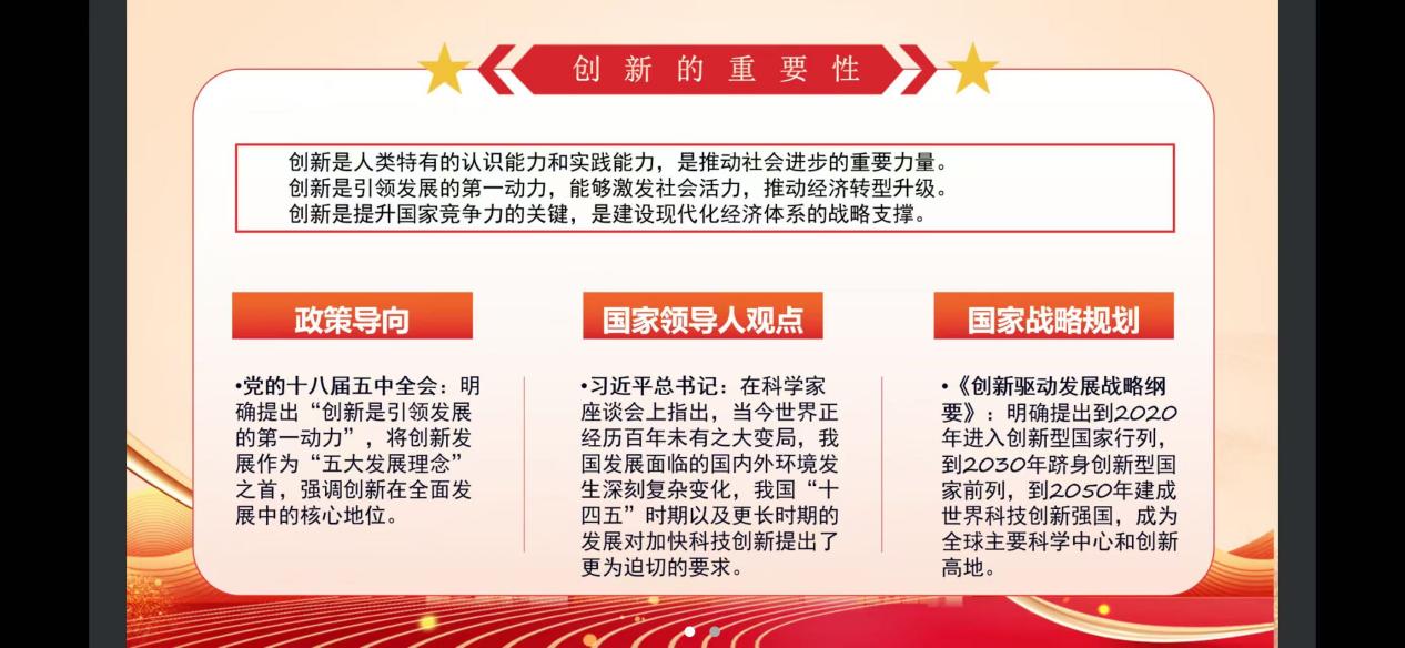 本次党小组会议主题为“创新是引领发展的第一动力”,小组从四个方面进行讨论,“创新的重要性”、“国家对创新发展的具体要求”、“我国创新发展的成就与展望”以及“党员在创新中的实践与责任”。创新是人类特有的认识能力和实践能力,是推动社会进步的重要力量。