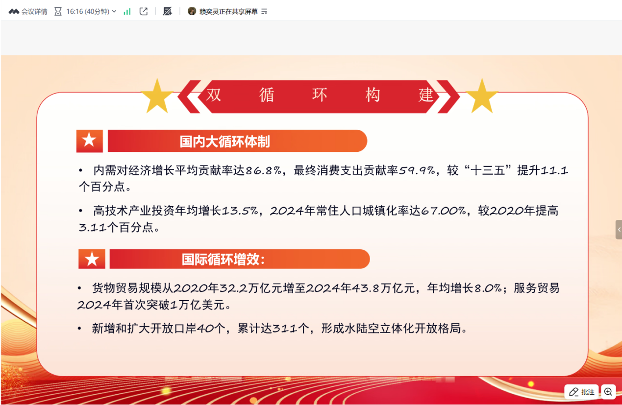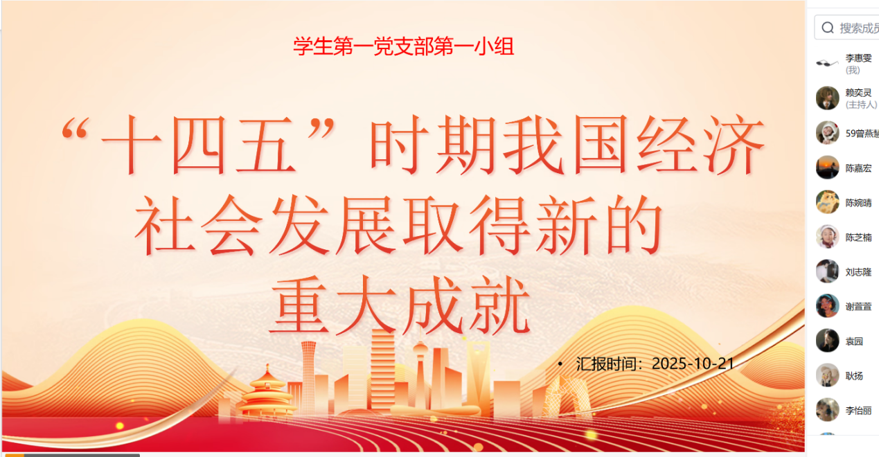 数字经贸学院第一学生党支部第一党小组以“十四五”时期我国经济社会发展取得新的重大成就为主题召开了党小组会议,组织党小组成员学习国家在经济、创新、双循环、民生等领域的成果,加深对高质量发展的认知,增强家国认同感,激发成员将个人成长融入国家发展的责任感。