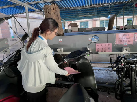 随着活动的圆满落幕,经贸e起奋进队并未停歇,志愿者们携带着精心印制的电动车消防安全宣传册到达居民的电动车停放区域。