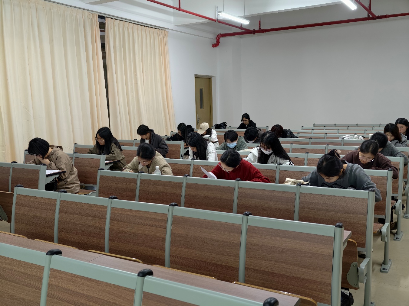 考试当晚,考场内秩序井然。同学们仔细审题、沉着应考,笔尖在试卷上沙沙作响,勾勒出奋斗的模样;听力环节专注凝神,阅读部分细致推敲,写作与翻译时奋笔疾书,展现出扎实的备考功底。监考人员严格履职,全程规范引导,从分发试卷到收卷清点,流程衔接顺畅,营造出严肃而不失温馨的考试氛围。