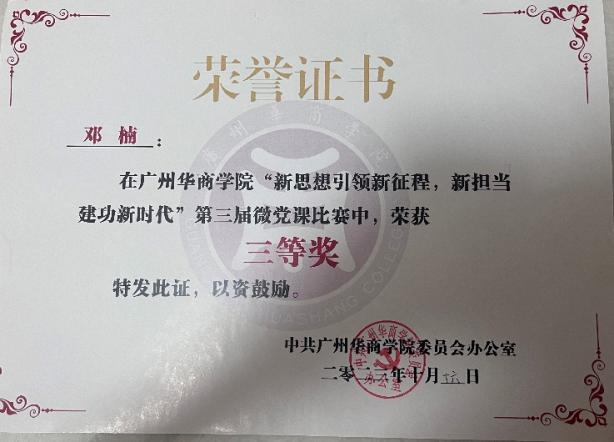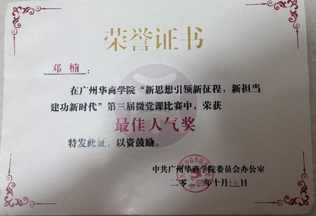 红心向党,步履铿锵。作为太阳集团tyc138学生第一党支部副书记,邓楠同志政治立场坚定,思想觉悟过硬。她积极参与党组织活动,深入学习党的理论,曾获校优秀共产党员、校优秀共青团干部等称号。在“新思想引领新征程,新担当建功新时代”微党课比赛中,她荣获三等奖及最佳人气奖,用实际行动诠释了党员的先锋模范作用。