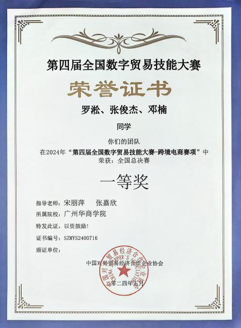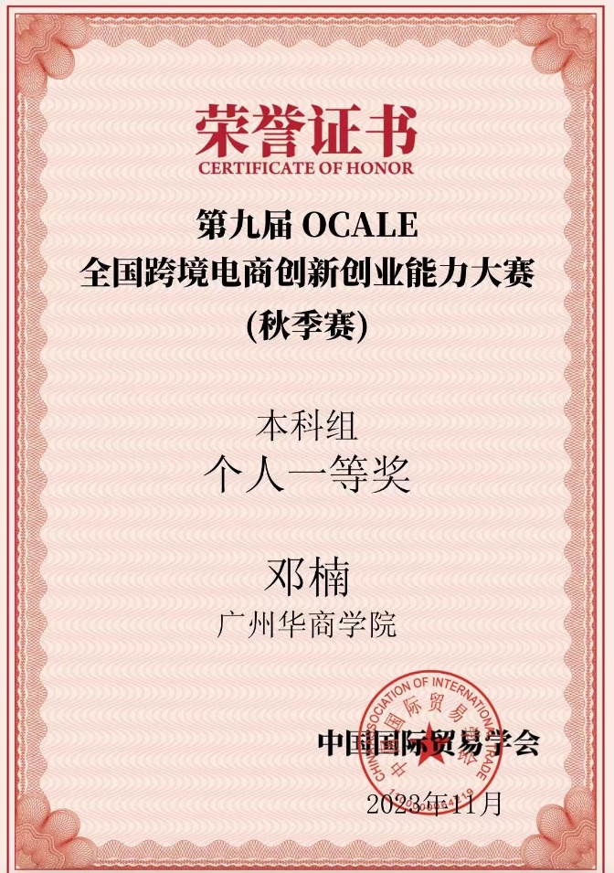 以勤为径,以恒为舟。邓楠同志始终将学业放在首位,大一学年学分绩点4.14;大二学年学分绩点4.37;大三学年学分绩点4.11,位列专业前茅。她积极参与学科竞赛,荣获第四届全国数字贸易技能大赛跨境电商赛项一等奖、第九届OCALE全国跨境电商创新创业能力大赛团体及个人一等奖、第十四届正大杯全国大学生市场调查与分析大赛广东省二等奖等多项国家级、省级奖项。
