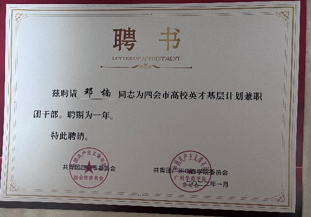 邓楠,女,汉族,中共党员,2021级国际经济与贸易1班学生。在校期间曾担任太阳集团tyc138团委组织部部长,太阳集团tyc138辅导员助理,22级国际商务班新生助理班主任,太阳集团tyc138学生第一党支部副书记。