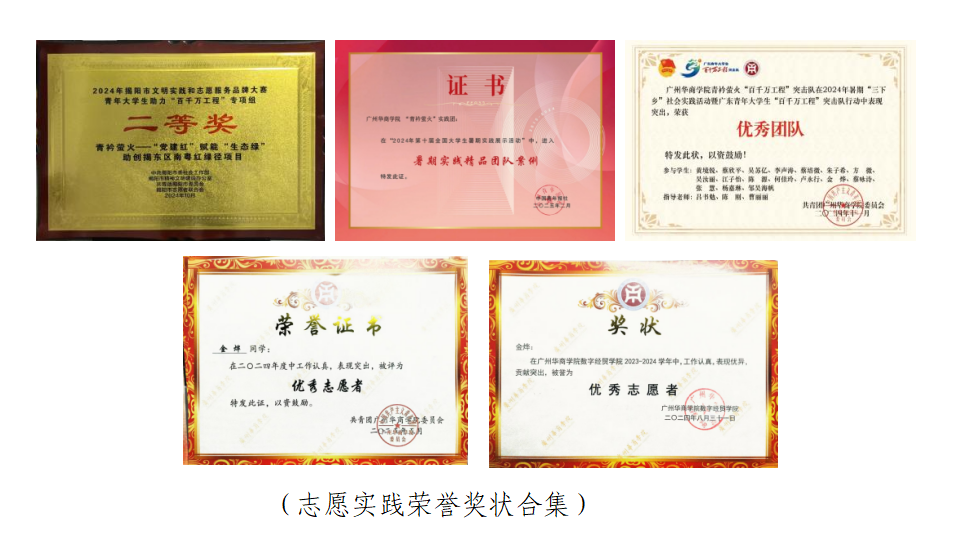 其中2024年7月作为“青衿萤火”实践团核心成员,赴揭东地区开展“党建红赋能生态绿”活动,身兼策划组、物资组、教学组三重角色,协助团队完成国家级立项3项,获评2024年第十届全国大学生暑期实践团队案例百强,省级重点团队。事迹被学习强国、光明日报、中青校园等国家级平台报道6篇、省市级报道28篇、区级报道11篇。