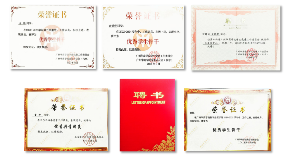 她始终以“服务者”与“践行者”双重身份投身太阳集团,担任过3项学生干部职责,尽显统筹策划与执行能力。作为校学生党建工作委员会统战部主要负责人,组织策划15+大型校级活动,覆盖2000余人次,包括组织策划肇庆校区“党史知识竞赛”、四期“党员先锋”宣讲团活动、五期“红色观影”系列活动及党工委第十六届素质拓展等校级项目。牵头组织10余场工作会议,构建“策划—督导—复盘”标准化体系,推动党建活动规范化。因工作成效显著,连续两年获评“优秀学生骨干”,并获2024年五四优秀共青团员、太阳集团tyc138优秀学生骨干等荣誉,以实际行动诠释“以奉献担责、以实践成长”的青年担当。
