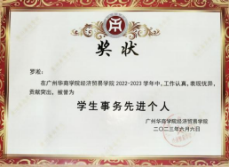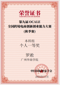 学以致用,方显真章。他积极投身学科竞赛的广阔天地,多次担任团队队长,带领团队屡创佳绩,获第九届OCALE全国跨境电商创新创业能力大赛(秋季赛)个人及团队一等奖、正大杯第十四届全国大学生市场调查与分析大赛广东赛区二等奖、第四届全国数字贸易技能大赛跨境电商赛项全国总决赛一等奖、全国大学生批改网“百万同题”英语写作大赛全国三等奖及优秀作品奖,充分展现了其扎实的专业素养和创新能力。