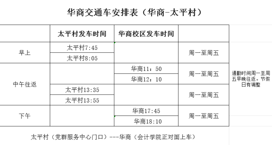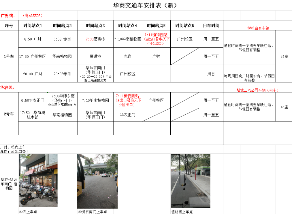 一、广州校区1.广财6:50--赤岗6.58--磨碟沙7:00--华南植物园7:10--植物园站7:11(A出口君临天下小区出口)--广州校区;2.华农6:50--华师东南华师正门7:00--华南植物园7:10--植物园站7:11(A出口君临天下小区出口)--广州校区 ;3.返程时间:17:50广州校区上车 ; 4.太平村 按平时通勤正常往返;5.3月1日(周日)晚20:00广财--广州校区车辆正常运行;