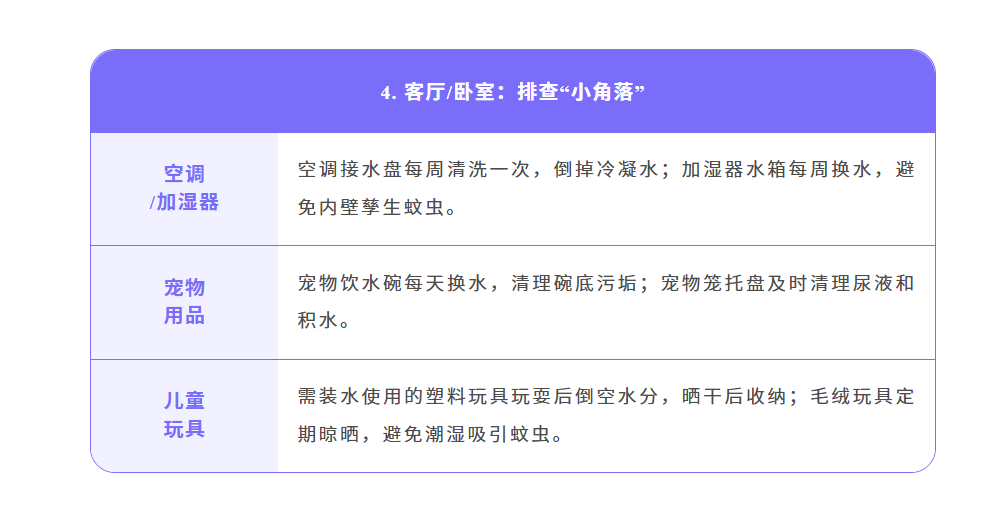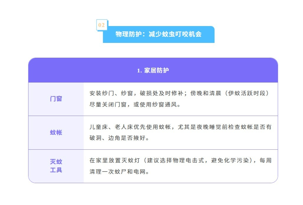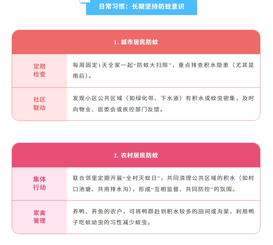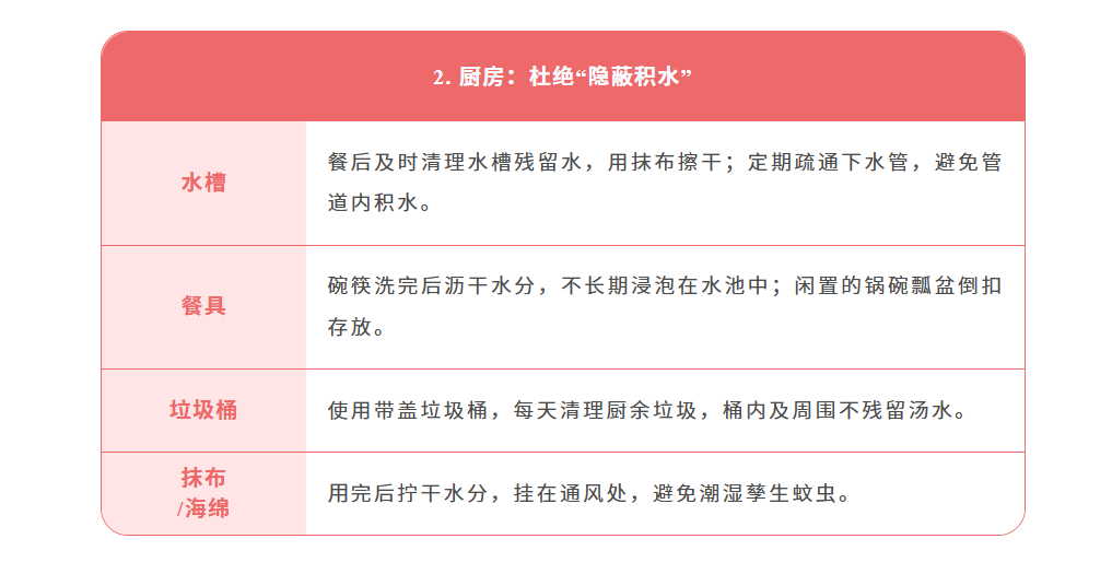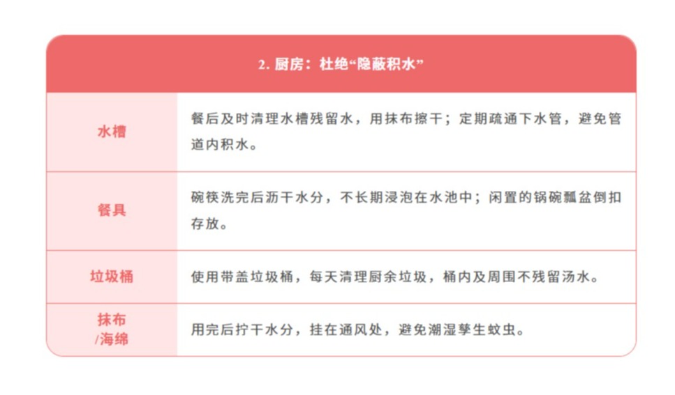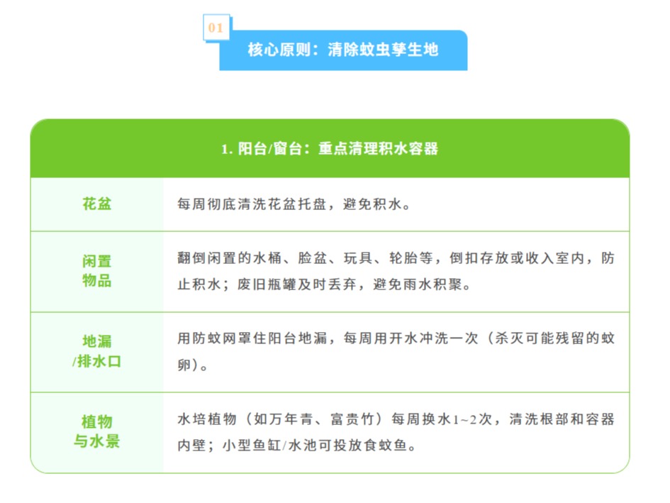 随着气温升高、降雨频繁蚊虫进入活跃期,基孔肯雅热和登革热都是经伊蚊叮咬传播的急性传染病,而伊蚊依赖积水繁殖,一旦家中存在积水等孳生地,就可能成为养育蚊子的“温床”。家庭作为蚊虫孳生和叮咬的高频场景,是防控的第一道防线,没有积水就没有蚊虫孳生,没有蚊虫就没有基孔肯雅热和登革热的传播。为了从源头切断传播链守护家人健康,这份《家庭防蚊清单》快收好并行动起来让蚊虫无处遁形!