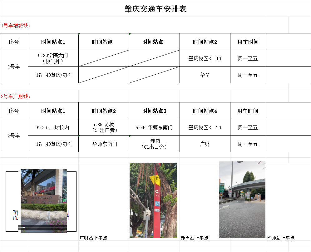 二、肇庆校区 1.广州校区6:30---肇庆校区 2.广财6:30--赤岗6:35--华师东南门6:45--肇庆校区 ; 3.返程时间:17:40肇庆校区返回 ; 三、8月28日-29日两天,9月1日开始正常发车