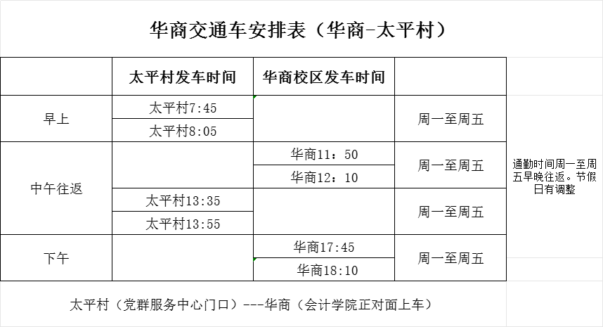 一、广州校区1.广财6:50--赤岗6.58--磨碟沙7:00--华南植物园7:10--植物园站7:11(A出口君临天下小区出口)--广州校区;2.华农6:50--华师东南华师正门7:00--华南植物园7:10--植物园站7:11(A出口君临天下小区出口)--广州校区 ;3.返程时间:17:50广州校区上车 ; 4.太平村 按平时通勤正常往返;5.8月31日(周日)晚20:00广财--广州校区车辆运行;